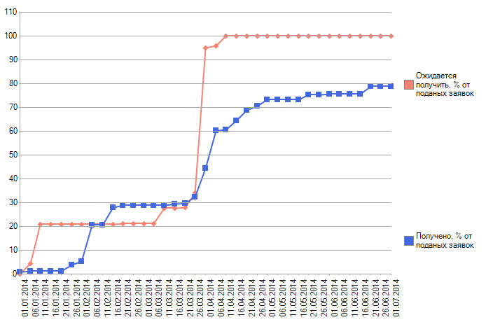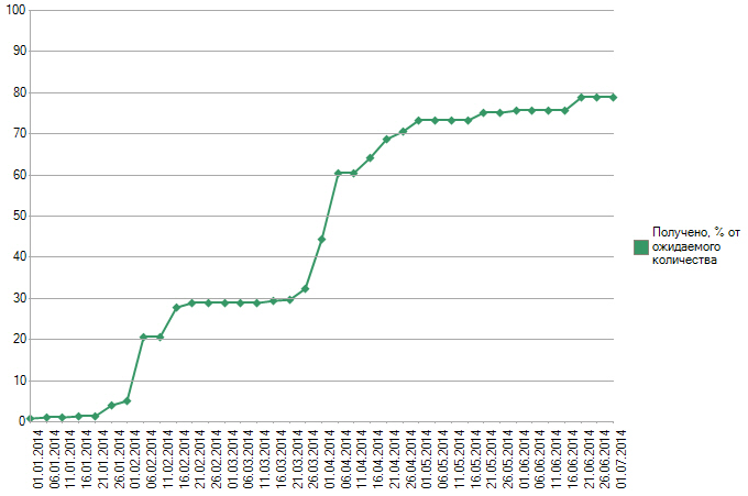 Красной линией на графике отображается максимально допустимый по регламенту, ожидаемый график завершения выбора поставщиков. Т.е. постепенно в ходе периода планирования закупок значение ожидаемого количества позиций, по которым выбор поставщиков завершен, поднимается до максимума – 100%. Синяя линия отображает фактический процент позиций, по которым выбор поставщиков осуществлен и уже заключены договора.