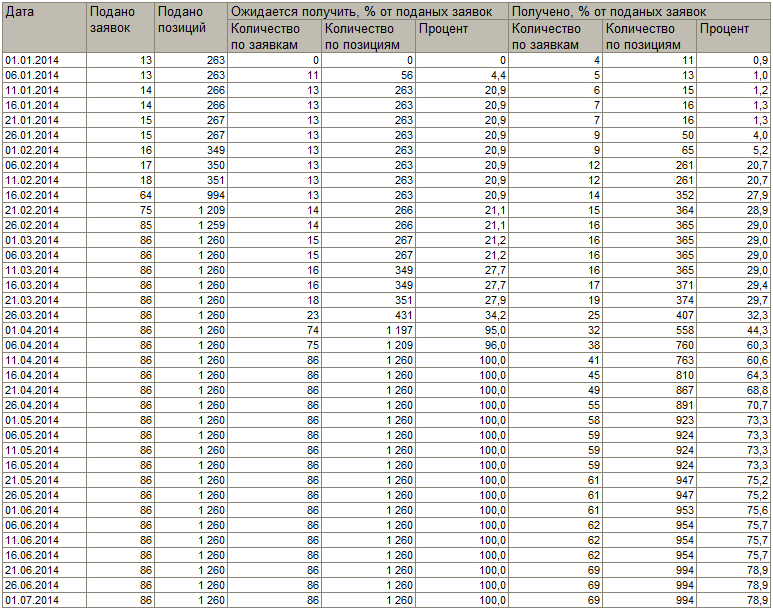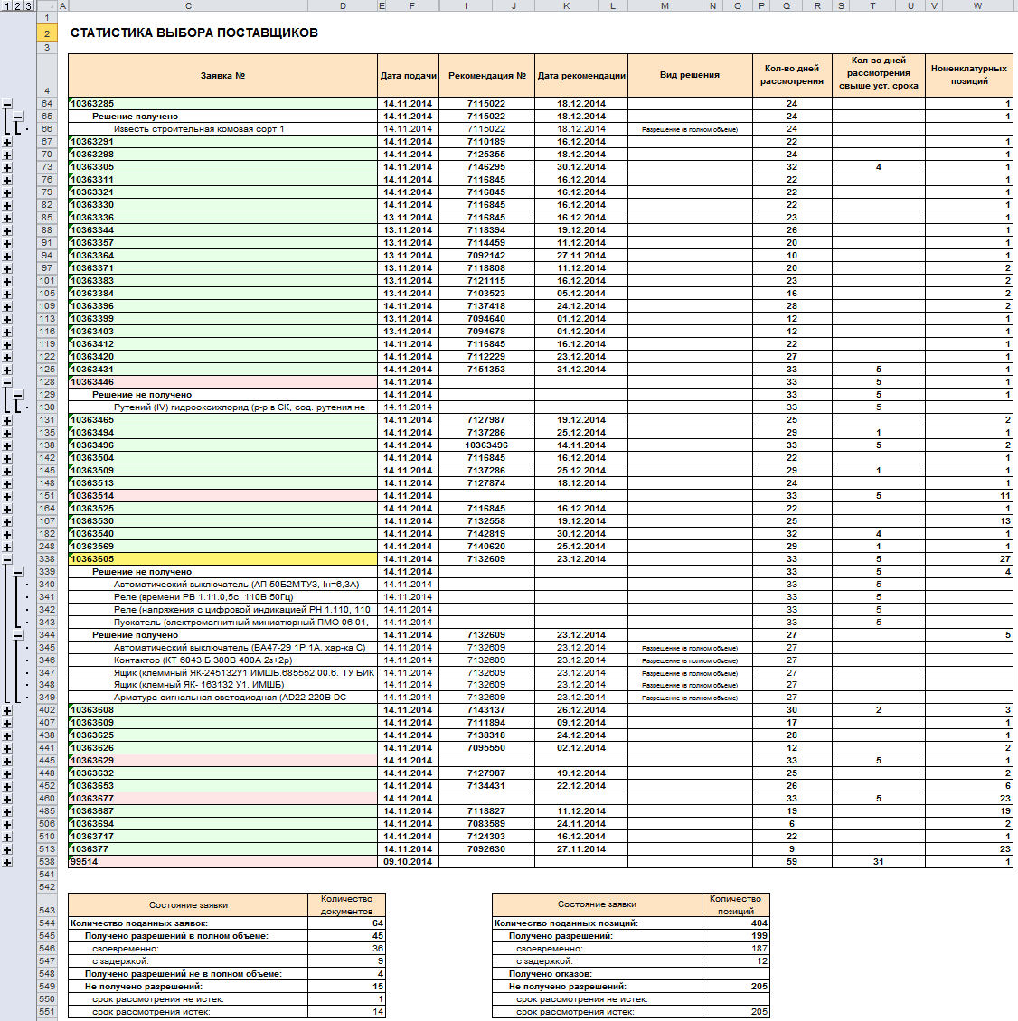 Для удобства анализа проблемные заявки желательно выделять цветом. Например, как видно на приведенном выше рисунке, заявки, по которым выбор поставщика не осуществлен, выделяются красным цветом. Выполненные заявки уместно отображать зеленым цветом, а желтым показывать те заявки, которые частично закрыты, но имеют и проблемные позиции.